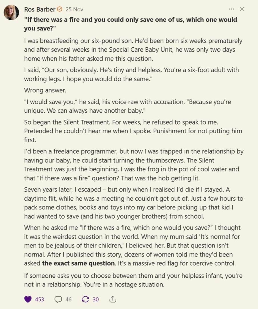 Award winning novelist and Substack writer Ros Barber has spoken openly and candidly about her experience of domestic abuse. In one of her notes, she shares an experience that captures the true nature of an abuser’s loyalty test. While she was breastfeeding their newborn baby, her partner asked who she would save if there were a fire and she could only choose one of them. She answered instinctively that she would save their baby, who was tiny and completely dependent on her.